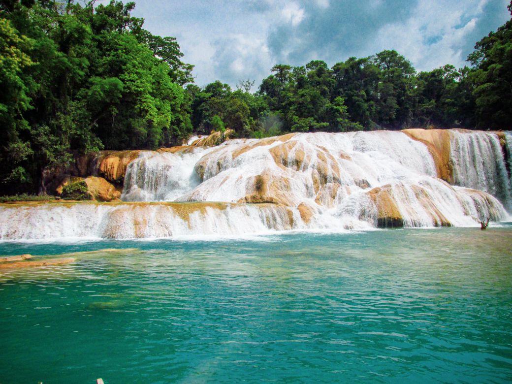 ¿Qué es lo primero que imaginas cuando digo «cascada»? si es lo mismo que yo, puedes pensar que Agua Azul es una caída de agua espectacular, punto. Sin embargo, Agua Azul son varias cortinas de agua que se deslizan sobre rocas amarillas hacia pozos turquesas, y que van internándose en la selva de Chiapas en forma de escalera.